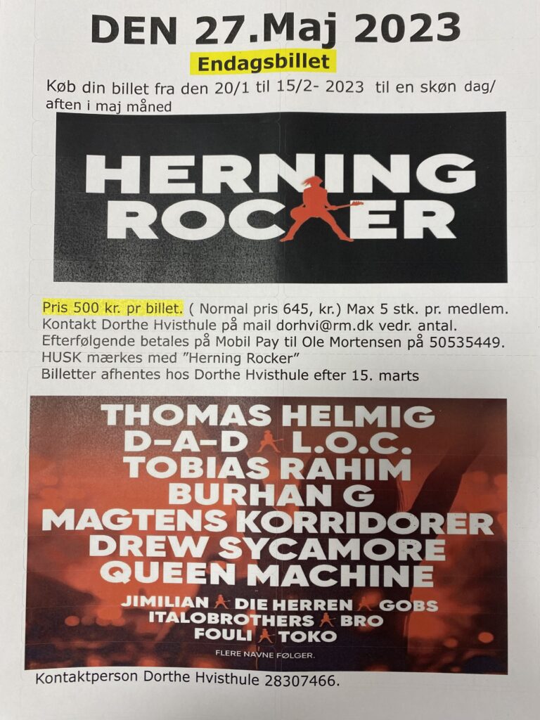 Herning Rocker 2026 Personaleforeningen PERGØ har reserveret 130 to-dags billetter, den 29. & 30. maj 2026 Billetterne sættes til salg fra mandag den 5. januar 2026 og slutter senest 1. april 2026 eller når der[...]