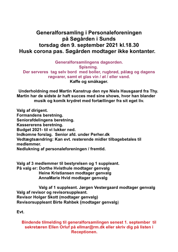 På grund af sundhedsstyrelsens og regeringens anbefalinger er det ikke muligt at gennemføre generalforsamlingen.
